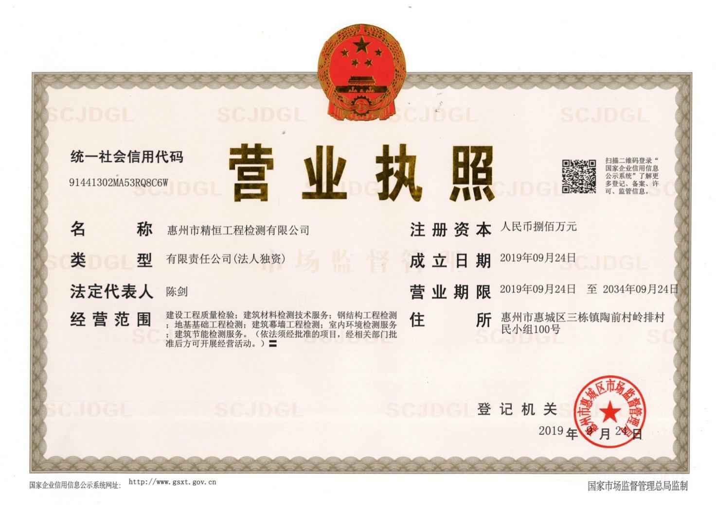 2021年3月12日,我司取得广东省市场监督管理局颁发的检验检测机构资质认定证书,同年6月10日取得惠州市住房和城乡建设局颁发的建设工程质量检测机构资质证书。主要检测范围:建筑工程材料检测、建筑门窗工程检测、装饰装修材料检测、主体结构工程检测、市政工程现场检测、建筑电气检测、建筑节能检测等。